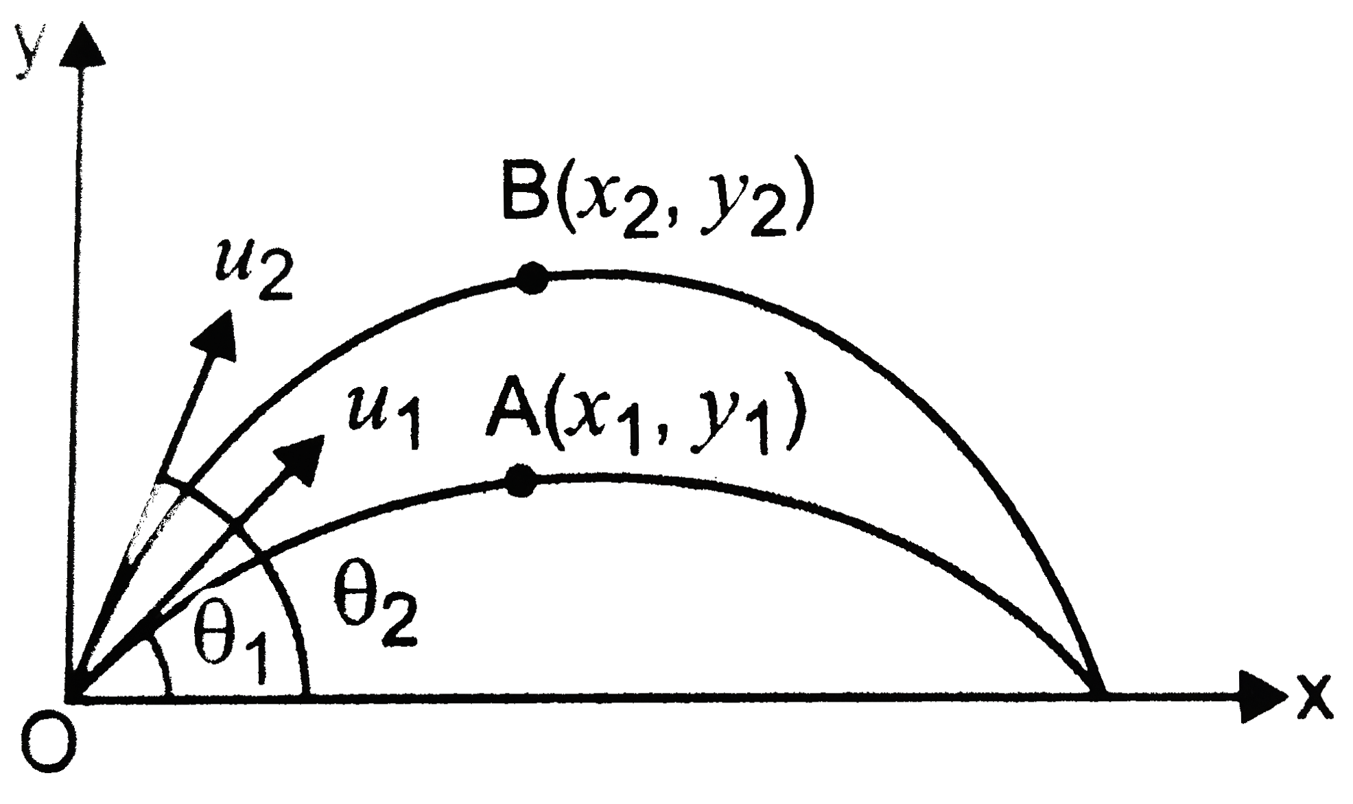 Let the two projectiles be thrown from (O) in the ` X-Y` plane with velcityes ` u_(1)` and `u_(2)` making angles ` theta_(1) and theta_(2)` respectively with x-axis. After time (t) let one projectile reaches at (A) `(x_(1)`,` y_(1))` and another projectile reaches at ` B (x_(2), y_(2)). Fig. 2 (d).32. Then