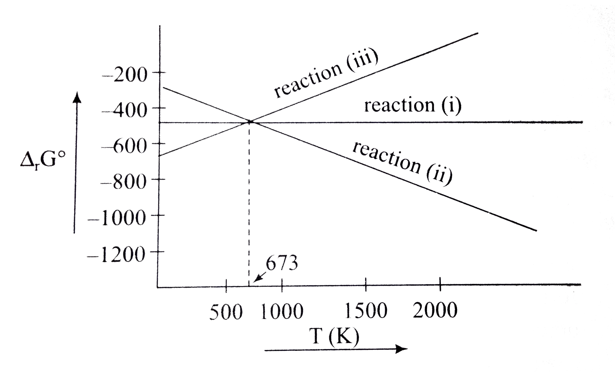 The three curve have been found to intersect at `673 K` it 6 imples that above this temperature the reaction (ii) is most stable .it mean ns that carbons can reduce any metal oxide at very high temperature and is then itself oxident is `CO`. However , the reduction with carbon at high temprature is not prefent in all cases due in the following reasons:
