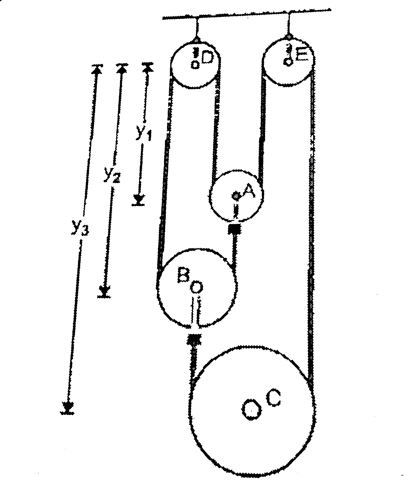 - In the pulley system shown the movable pulleys A,B and C have mass m e...
