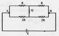in the figure (a) The equivalent resistance of the network between points A and B is independent of value of Q. (b) The equivalent resistance of the network between points A and B is `4/3 R`. (c) The current through Q is zero.