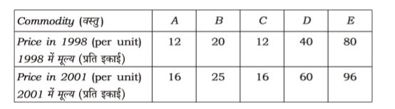 - निम्न आँकड़ों से 1998 को आधार वर्ष मानकर वर्ष 2001 के लिए मूल्यानुपातों...
