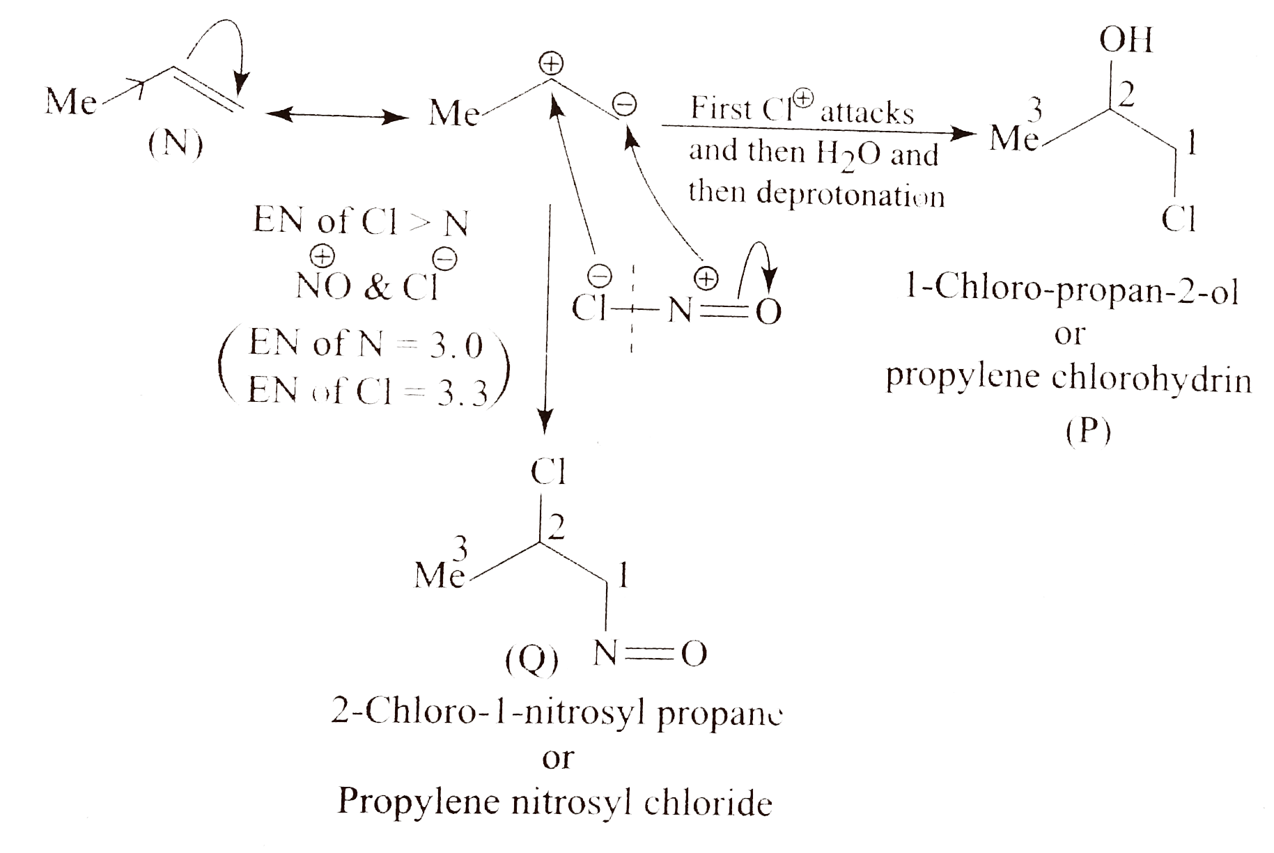 - CH(3)CH=CH(2)+NOClrarrP Identify the product.