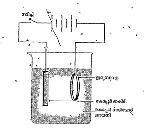 - ഇരുമ്പു വളയിൽ ചെമ്പ് പൂശുന്ന വൈദ്യുതലേപനം പ്രക്രിയയാണ് താഴെ തന്നിരിക്ക...