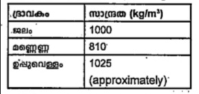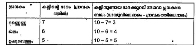 രണ്ടു പട്ടികകളിലെയും വിവരങ്ങൾ പരിശോധിച്ച് താഴെ കൊടുത്ത ചോദ്യത്തിനു ഉത്തരം കണ്ടെത്തുക. കല്ലിന് പ്ലവക്ഷമബലം ഏറ്റവും കൂടുതൽ അനുഭവപ്പെട്ടത് ഏതു ദ്രാവകത്തിലാണ്?