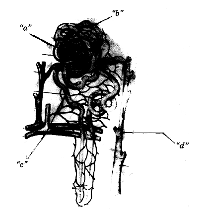 - In the accompanying diagram of urine formation, identify a, b, c and d