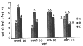 - दिया गया दंड आरेख (बार ग्राफ) तीन शोरूम -A,B और C के द्वारा जनवरी, फर...