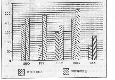 - निम्न दंडारेख में दो व्यायामशालाओं A एवं B में वर्ष 1990 से 1994 तक ना...