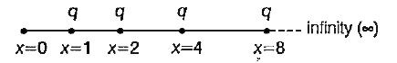 - Infinite charges 'q' each are placed at x = 1, 2, 4, ... Find the elec...