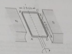 The coil is held between the poles of a large magnet so that the coil can rotate about an axis thorugh its centre. The magnet produces a uniform magnetic field of flux density B between its poles. When the current in the coil is 170 mA, the maximum torque produced in the coil is `2.1 xx 10^-3 N m`. The current in the coil in (a) is switched off and the coil s positioned as shown in the figure. The coil is then turned thorugh an angle of `90^@` in a time of 0.14 s. Calculate the average e.m.f. induced in the coil.