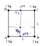 - Particle of masses 2 kg, 2 kg, 1 kg and 1 kg are placed at the corners...