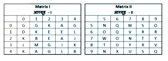 A word is represented by only one set of numbers as given in any one of the alternatives. The sets of numbers given in the alternatives are represented by two classes of alphabet as shown in the given two matrices. The columns and rows of Matrix-I are numbered from 0 to 4 and that of Matrix-II are numbered from 5 to 9. A letter from these matrices can be represented first by its row and next by its column, for example, 'F' can be represented by 24, 41 etc and 'P' can be represented by 58, 87 etc. Similarly, you have to identify the set for the word 'UNIT'.