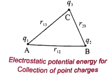 (iii) In the same way, to bring the charge`q_3` to the point C, work has to be done against the total electric field due to both the charges `q_1` and `q_2`. So the work done to bring the charges `q_3` is `= q_3 (V_(1C) + V_(2C))`. Here `V_(1C)` is the electrostatic potential due to charge `q_1` at point C and `V_(2C)` is the electrostatic potential due to charge `q_2` at point C.