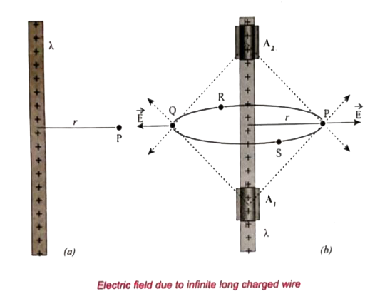 Let us consider an infinitely long straight wire having uniform linear charge density `lambda`. Let P be a point located at a perpendicular distance r from the wire. (Fig (a))