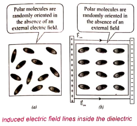When an external electric fiels is applied, the dipoles inside the polar molecule tend to align in the direction of the electric field. Hence a net dipole moment is induced in it. Then the dielectric is said to be polarized by an external electric field (Fig. (b)).