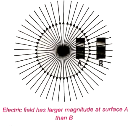 Figure shows electric field lines from a positive point charge. The magnitude of the electric field for a point charge decreases as the distance increases `(|vecE|prop1/r^2)`. So the electric field has greater magnitude at the surface A than at B. Therefore the number of lines crossing the surface A is greater than the number of lines crossing the surfaceB. Note that at surface B the electric field lines are farther apart compared to the electric field lines at the surface A.