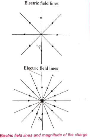 For example in the figure, the electric field lines are drawn for charges +q and -2q. Note that the number of field lines emanating from the +q is 8 and the number of field lines ending at -2q is 16. Since the magnitude of the second charge is twice that of the first charge, the number of filed lines drawn for -2q is twice in number than that for charge +q.