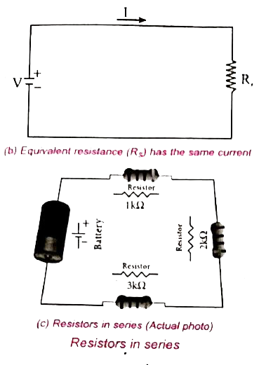 When several resistances are connected in series, the total or equivalent resistance is the sum of the individual resistances. (Fig. (b)).