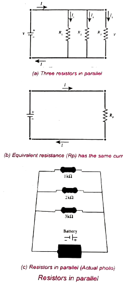 Here `R_p` is the equivalent resistance of the parallel combination of the resistors. Thus, when a number of resistors are connected in parallel, the sum of the reciprocal of the values of resistance of the individual resistor is equal to the reciprocal of the effective resistance of the combination.(Fig. (b))