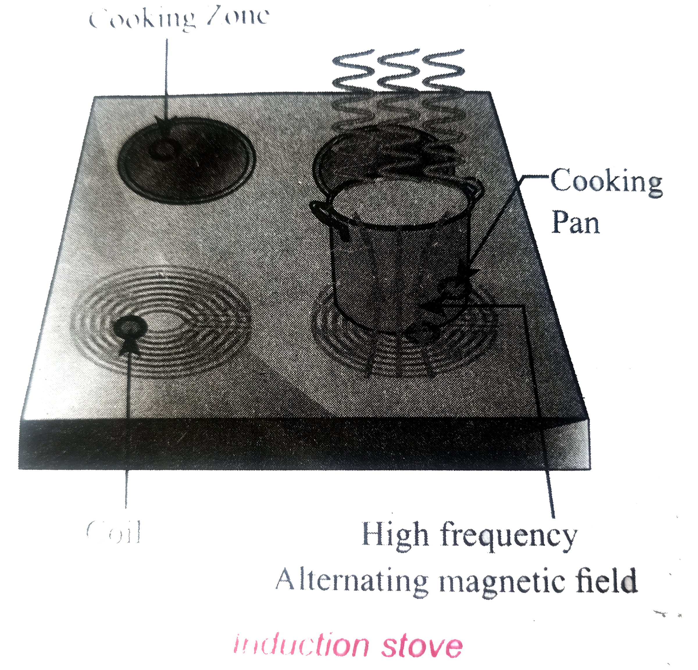 Induction stove is used to cook the food quickly and safely with less energy consumption. Below the cooking zone,there is a tighty wound coil of insulated wire . The cooking pan made of suitable material, is placed over the cooking zone. When the stove is switched on, an alternating current flowing in the coil produces high frequency alternating magnetic field which induces very strong eddy current in the cooking pan. The eddy current in the pan produce so much of heat due to Joule heating which is used to cook the food.