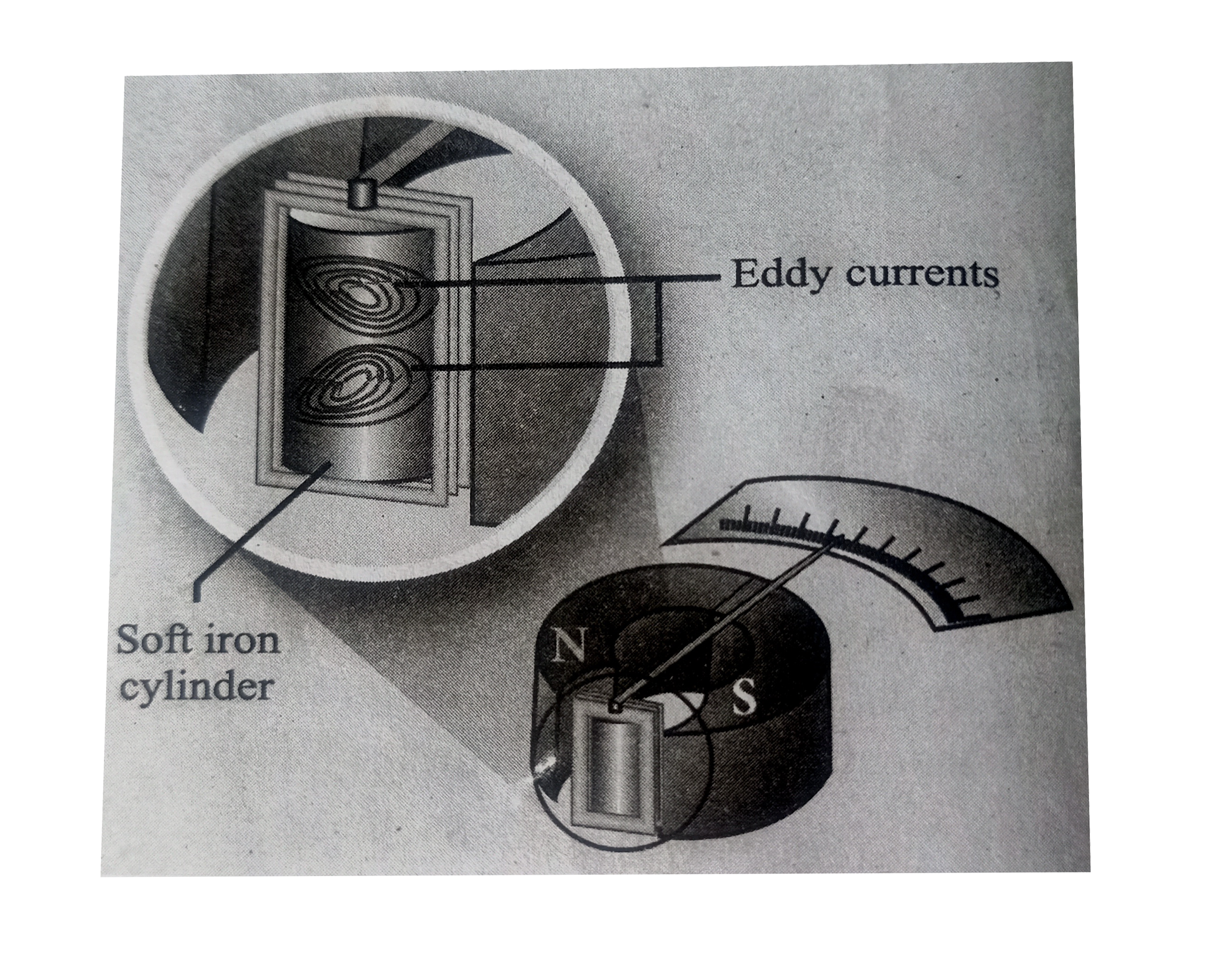 Electro megnetic damping: The armature of the galvanometer coil is woud on a soft iron cylinder. Once the armature is deflected, the relative motion between the soft iron cylinder and the radial magnetic field induces eddy current in the cylinder.