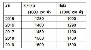 - निम्नांकित तालिका में, पांच वर्ष में किसी कंपनी के निश्चित उत्पाद का उ...