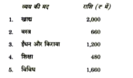 - एक व्यक्ति का मासिक व्यय 6,000 है । विभित्र मद पर व्यय का बंटन निम्नान...