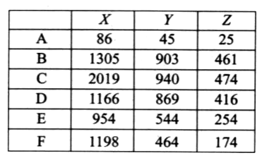 निम्नलिखित आंकड़े वर्ष 2010 में छः अलग-अलग जेलों A,B,C,D,E और F से छोड़े गए दोषियों की संख्या ( गणना ) को निरूपित करते हैं, जिन्हों ने क्रमशः जेल की अवधि पूरी की (X ) जिन्होंने अपनी अवधि में कोई शैक्षणिक या तकनिकी प्रशिक्षण प्राप्त किया (Y) और जिन्हे कंपनी नियोजन ( प्लेसमेंट ) का प्रस्ताव प्राप्त हुआ (Z) ।