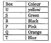 Six boxes P, Q, R, S, T and U are placed one above another such that they are of different colour i.e. Blue, Black, Yellow, Green, Pink and Orange but not necessary in same order. Two boxes are placed between R and T. Q is placed immediately above T. One Box is placed between the yellow coloured and black coloured box. S and R are of green and black colour respectively. Box U is placed above box R but not immediately above. One box is placed between S and the box which is of pink colour. Orange coloured box is placed immediately above blue coloured box. Box S doesn't place below the box which is black colour. U is not of orange colour. Box Q is not of blue colour. More than two boxes are placed below S.