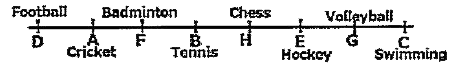 Eight students A, B, C, D, E, F, G, and H are sitting in a row. facing north but not necessary in the same order. No two successive students are sitting together according to alphabetical order. For Example :A does not sit with B, similarly, B does not sit with C and so on. They also like different sports like Hockey, Badminton, Swimming, Chess, Football, Volleyball, Tennis, and Cricket but not necessary in the same order. Either D or B sits at the extreme end of the row. A likes cricket and sits second from the left end of the row. D sits third to left of one who likes Tennis, B sits third to left of G, who likes Volleyball. G does not sit the extreme end of the line. The one who likes football sits second to left of F.E does not sit any of the extreme end of the line. One of the immediate neighbors of B likes Chess. F does not like Chess. The one who likes Swimming sits second to right of one who likes Hockey.