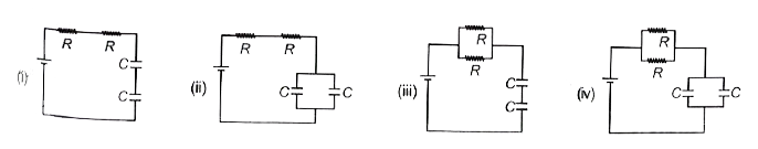 - नीचे दिये गये चार परिपथों में समय नियतांक tau(1)= CR, tau(2)= 4CR, tau...
