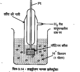 प्रवाहित की जाती है जिसके फलस्वरूप उसके ऊपर प्लैटिनम ब्लैक की परत चढ़ जाती है। यह प्लेट चित्र के अनुसार एक कांच की नली से घिरी रहती है जिसमें एक वायुमण्डल दाब पर हाइड्रोजन गैस प्रवाहित करने हेतु ऊपर से एक मार्ग होता है तथा कांच की नली के नीचे अवशेष हाइड्रोजन गैस निकालने हेतु एक अन्य मार्ग भी होता है। इस इलेक्ट्रोड को एक मोलर सांद्रण वाले हाइड्रोजन आयन विलयन (1.0M. HCl) में डुबा दिया जाता है। इस विलयन में एक वायुमण्डल दाब पर युद्ध शुद्ध हाइड्रोजन गैस की कुछ मात्रा प्लैटिनम की सतह पर अधिशोषित हो जाती है तथा शेष अम्ल के मोलर विलयन में विलीन हो जाती है। इस कारण कुछ मात्रा प्लैटिनम की सतह पर अधिशोषित हो जाती है तथा शेष अम्ल के मोलर विलयन में विलीन हो जाती है। इस कारण प्लैटिनम इलेक्ट्रोड पर अधिशोषित हाइड्रोजन गैस तथा विलयन में विद्यमान, हाइड्रोजन आयनों के मध्य साम्य स्थापित हो जाता है।