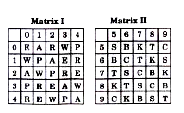 A set of letters is represented by only one set of numbers as given in any one of the alternatives. The sets of numbers given in the alternatives are represented by two classes of alphabets as in two matrices given below. The columns and rows of Matrix I are numbered from 0 to 4 and that of Matrix Il are numbered from 5 to 9. A letter from these matrices can be represented first by its row and next by its column, e.g. :'G' can be represented by 04, 11, 42, etc., and 'P' can be represented by 68, 75, 99, etc. Similarly, you have to identify the number set for the set of letters given below: NGAT