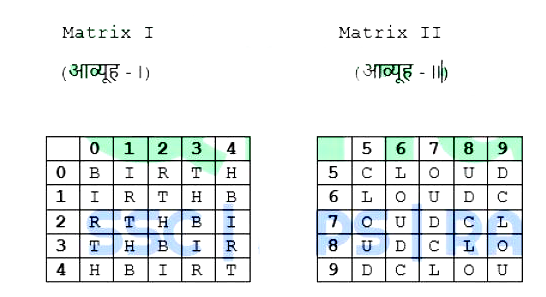 In the following question, a word is represented by only one set of numbers as given in any one of the alternatives. The set of numbers given in the alternatives is represented by two classes of alphabets as in two matrices given below. The columns and rows of Matrix I are numbered 0 to 4 and that of Matrix II are numbered 5 to 9. A letter from these matrices can be represented first by its row and then by its column, for example, C can be represented by 55, 69, etc. and D can be represented by 59, 68, etc. Identify the set for the word CHILD.