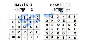 In the following question, a word is represented by only one set of numbers as given in any one of the alternatives. The set of numbers given in the alternatives is represented by wo classes of alphabets as in two matrices given below. The columns and rows of Matrix-I are numbered from 7 to 10 and that of Matrix-II from 2 to 6. A letter from these matrices can be represented first by its row and then by its column, example, 'D' can be written as 23 and 32. Identify the set for the word DOSSIER.