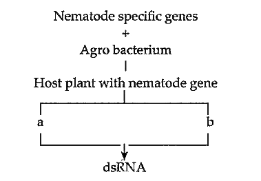 Using Agrobacterium vectors, nematode-specific genes are introduced into the host plant. The introduction of DNA produces both sense and anti-sense RNA in the host cells. These two RNAs being complementary to each other formed a dsRNA which initiated RNAi. Thus .a. is sense RNA and .b. is antisense RNA.