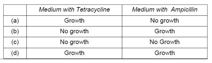 A foreign DNA was ligated at BamH1. The transformants were then grown in a medium containing antibiotics tetracycline and ampicillin. Choose the correct observation for the growth of bacterial colonies from the given table