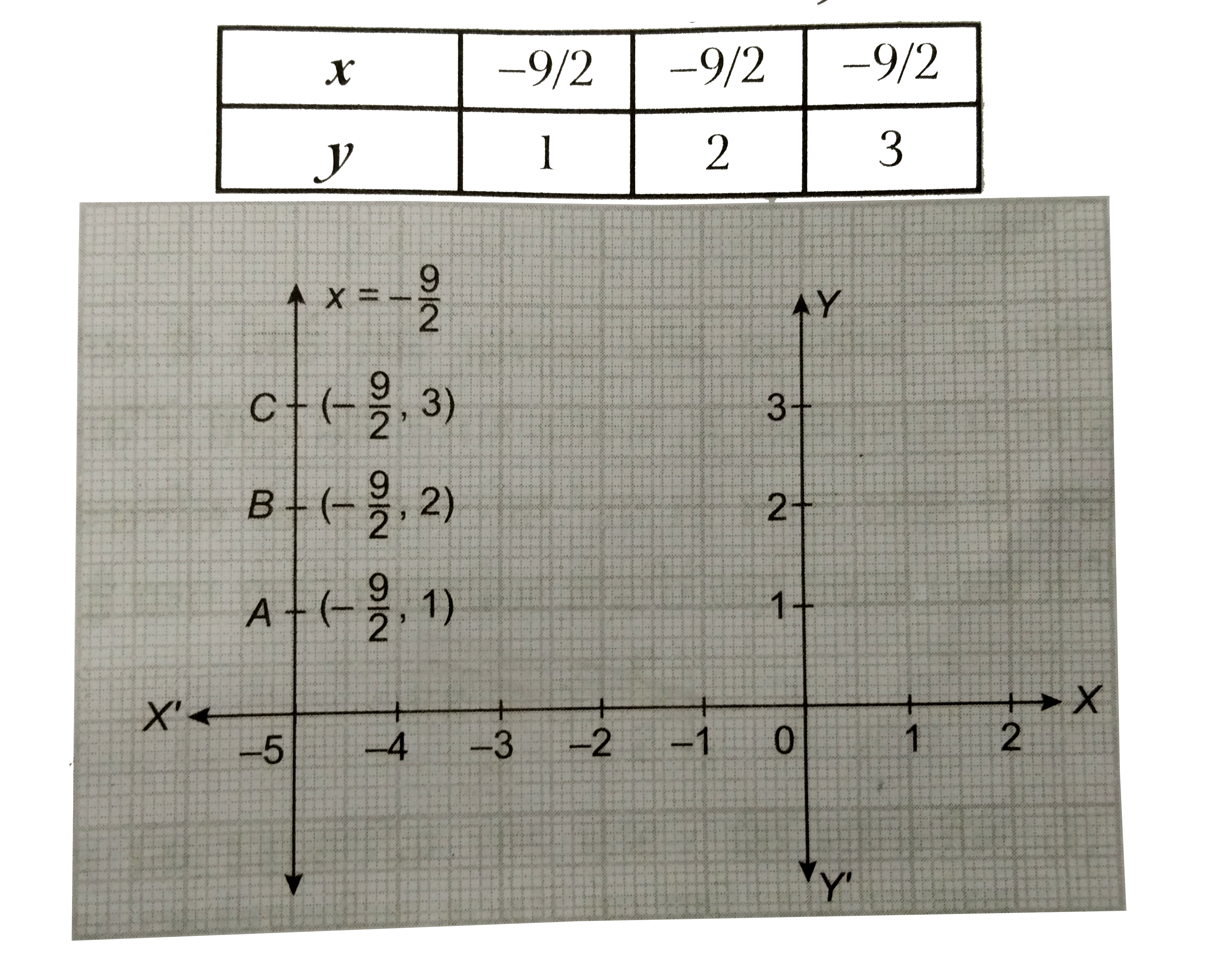 बिन्दुओ `A( -(9)/(2),1) ,B(-(9)/(2),2) ,C(-(9)/(2) ,2) ` को अंकित करके मिलाते है|यह `2x+ 9=0` का दो चर राशियों के रूप में अभीष्ट हल है