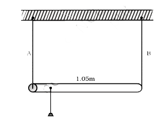 - 1.05 m लम्बाई तथा नगण्य द्रव्यमान कि एक छड़ को बराबर लम्बाई के दो तार...