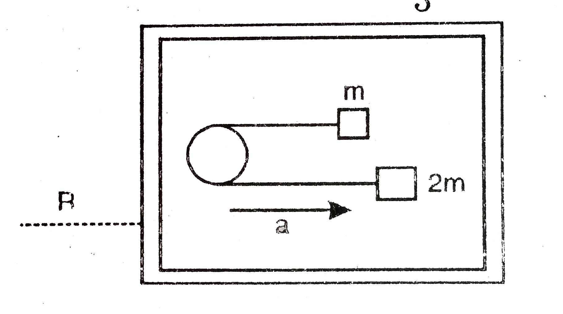 A table with smooth horizontal surface is placed in a cabin which moves in a circle of a large radius R Figure. A smooth pulley of small radius is fastened to the table. Two masses m and 2m placed on te tableare connected through a string going over the pulley. Initially the masses are held by a personwith the strings aslong teh outward radius and then the system is released from rest (with respect to the cabin). Find the magnitude of the initial acceleration of the mases as seen from the cabin and the tension in the starting.