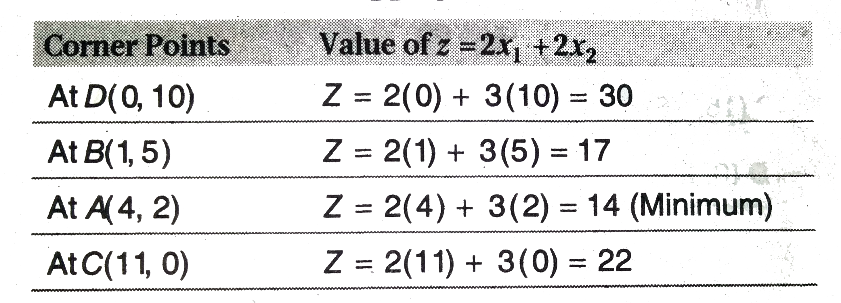 Thus minimum value of Z is 14, Here, fesible region is unbounded and the half plane , ` 2x_1+3x_2 lt 14 ` has no point in common with fessible region. So, required minimum vlaue of Z is 4.