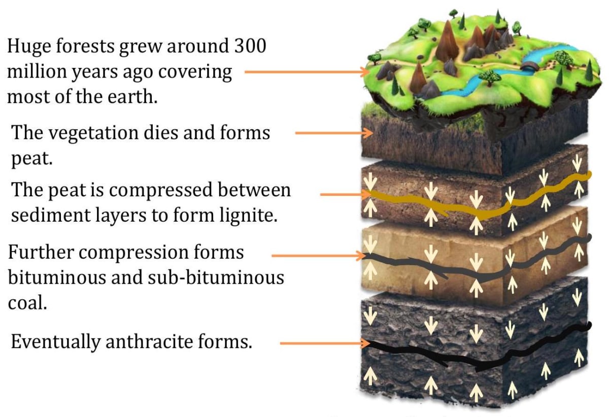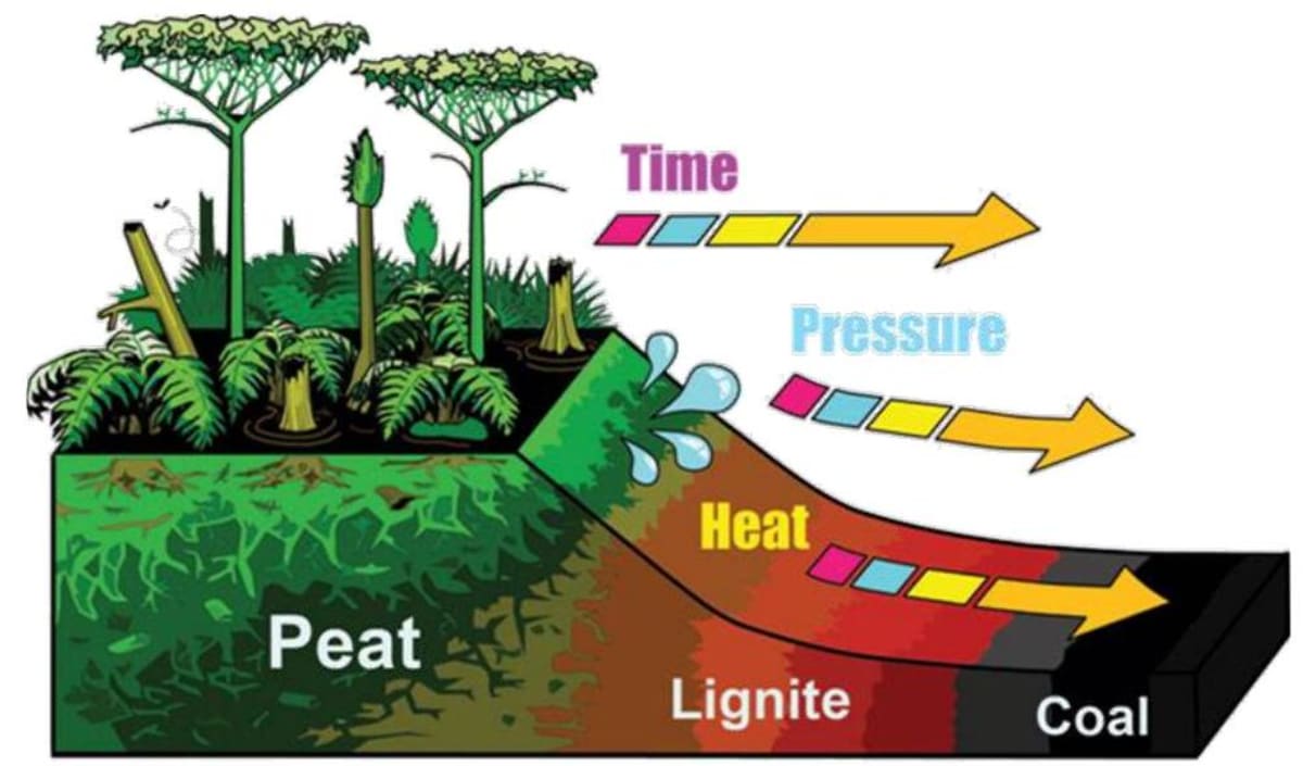 Story of formation: It is believed that millions of years ago, the ground below the forests was split open by natural forces such as earthquakes and volcanoes. The forests got buried under the surface of earth. Thus, the plants had no contact with oxygen. Successive layers of sediments sealed the buried plants. Over millions of years, these deposits were subjected to tremendous pressure and heat finally transformed them into coal.
