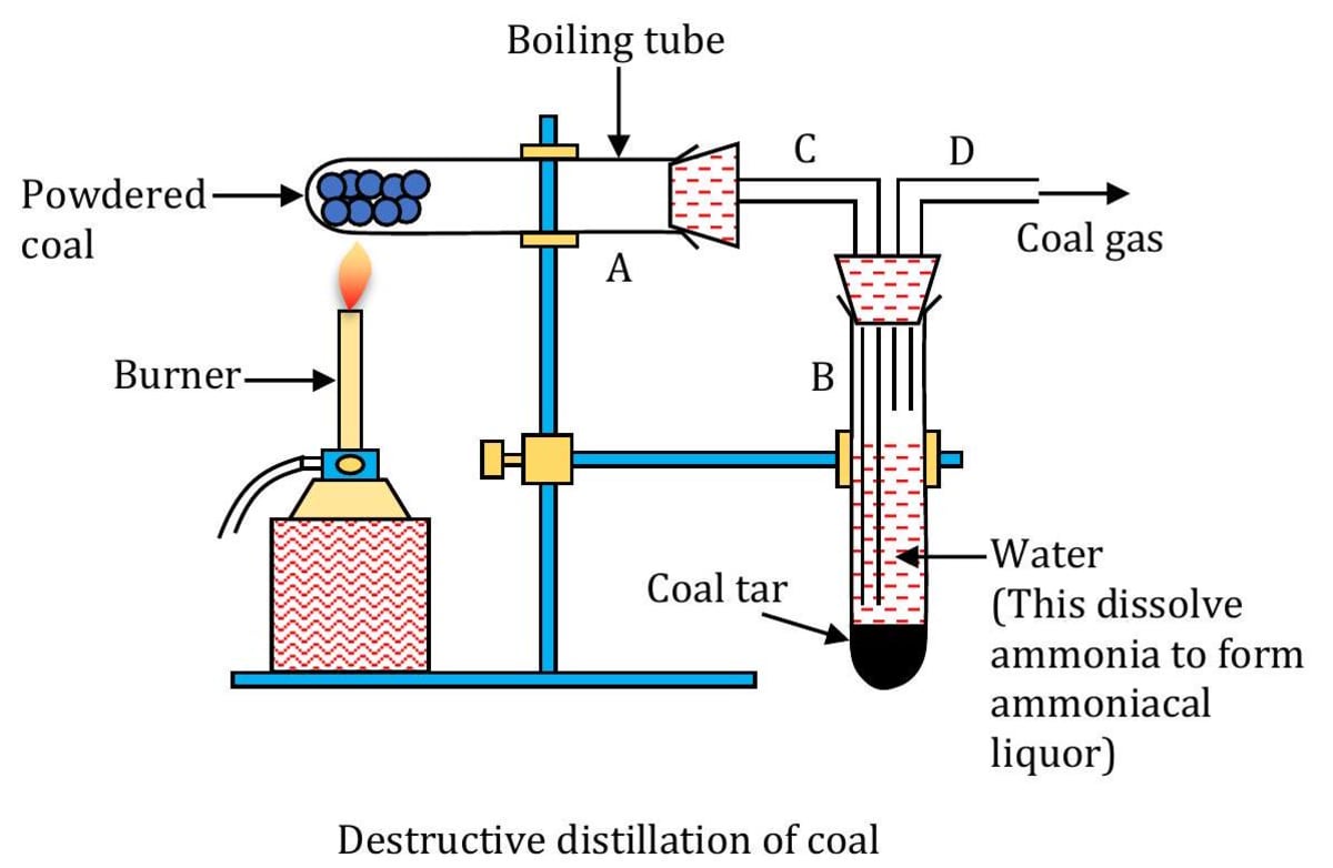 The process of heating coal in the absence of air is called the destructive distillation of coal. Coal contains a number of elements such as carbon, hydrogen, oxygen, nitrogen and sulphur. When coal is heated in the absence of air, a number of products are obtained. The main products obtained by the destructive distillation of coal are as follows: (1) Coke (2) Coal tar (3) Coal gas