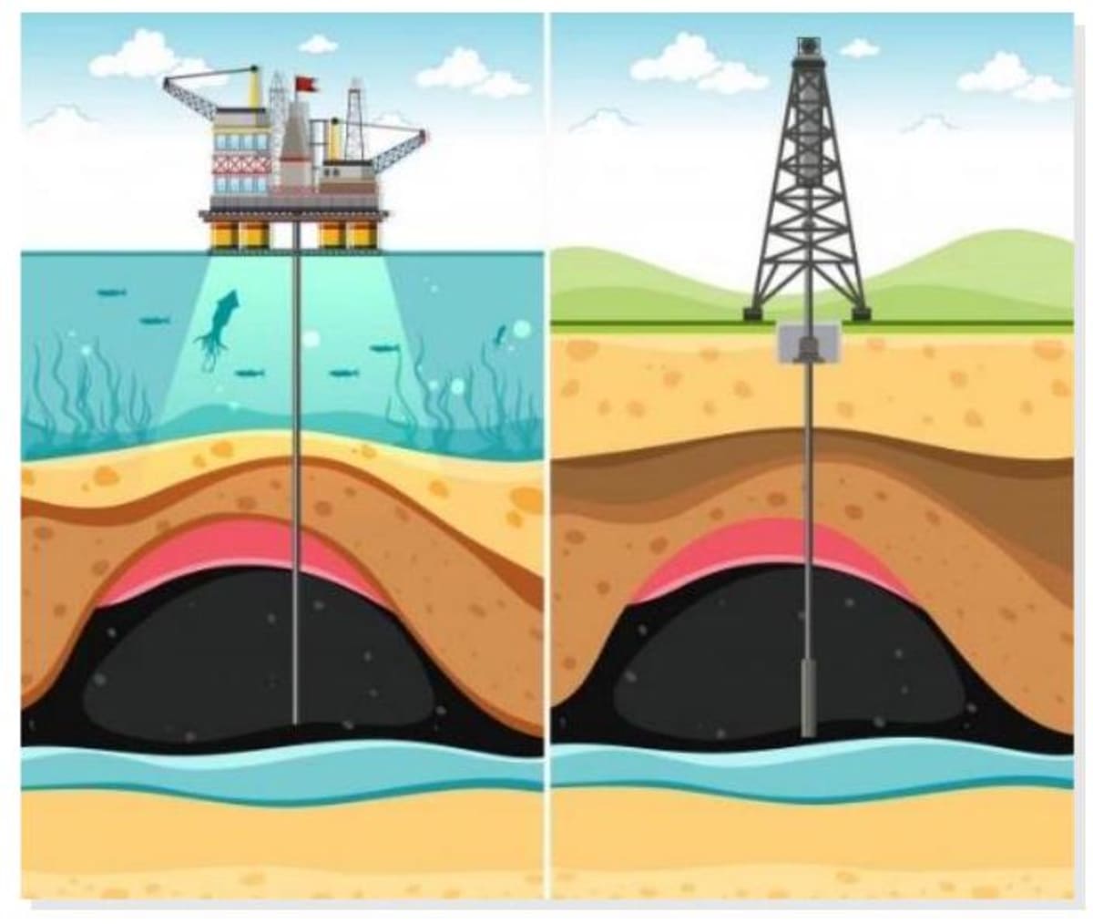 The hole is drilled in the Earth's crust and when it reached the rock cap, the natural gas comes out first with a great pressure. When the pressure of gas subsides, petroleum starts flowing out due to the pressure of natural gas.