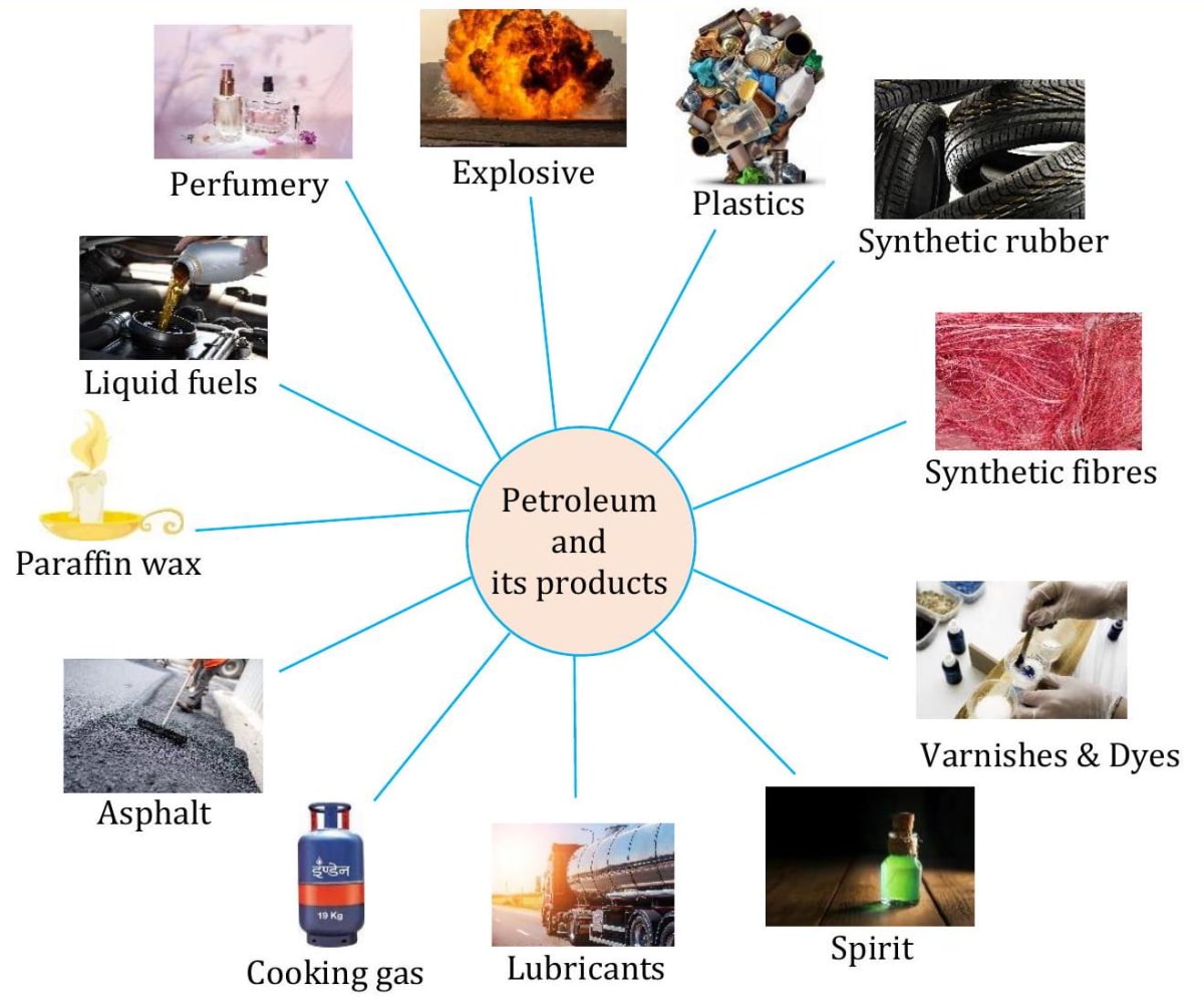 (1) Petroleum products are used as fuels. (2) Lubricating oils and Vaseline are used as lubricants. (3) Paraffin wax, products of petroleum is used for manufacturing candles, polishes, waxed paper, water proofing, etc. (4) Some of the by-products of petroleum after purification are used in the preparation of medicines, ointments, face creams and cosmetics.