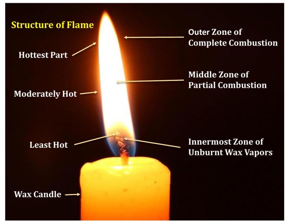 Structure of a flame In order to understand the structure of a flame, light a wax candle and watch its flame. Carefully note the different coloured zones in the flame. Starting from the base of the flame, a flame has three zones. (i) Inner most zone: It is cooler than outer zones and it is dark. (ii) Middle zone: It is the largest zone of candle flame. This zone gives soot and smoke. (iii) Outermost zone: This zone of the flame is thin and blue in colour. This is the hottest zone of the flame. The temperature of this zone is maximum around .