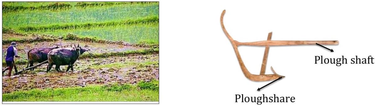 - Plough : It contains triangular iron strip called ploughshare and main part of the plough is a long log of wood called plough shaft. One end of the shaft is handle and other end is attached to a beam which is placed on the bulls necks. One pair of bulls and a man can easily operate the plough.
