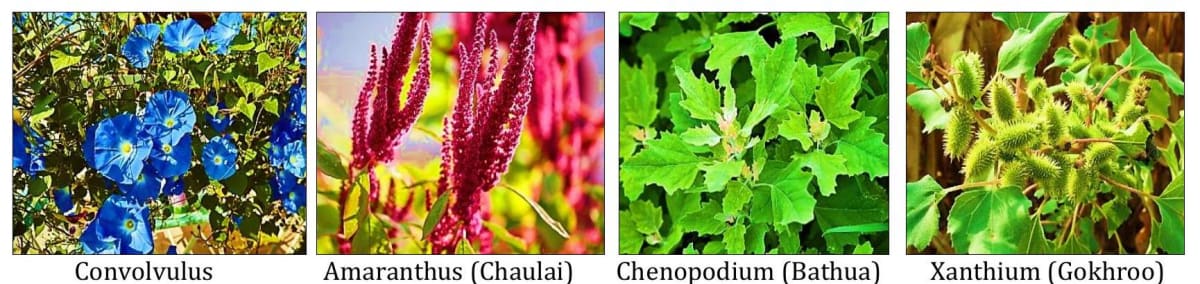 Some common weeds: Parthenium (Gajar grass), Convolvulus, Amaranthus (Chaulai), Chenopodium (Bathua), Xanthium (Gokhroo) and Dandelions, Cypernius rotundus (montha).