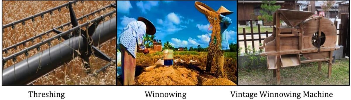 - Winnowing: In this process, the grain-chaff mixture is gradually dropped on the ground from a height. The heavier seeds fall vertically down, while the lighter chaff is blown away by wind.