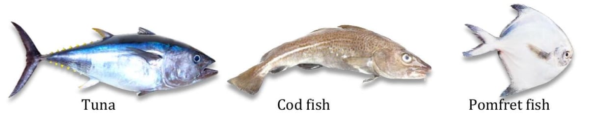 (iii) Marine fishes : Tuna, Cod and Pomfret, bombay duck, sardines, mackerel.