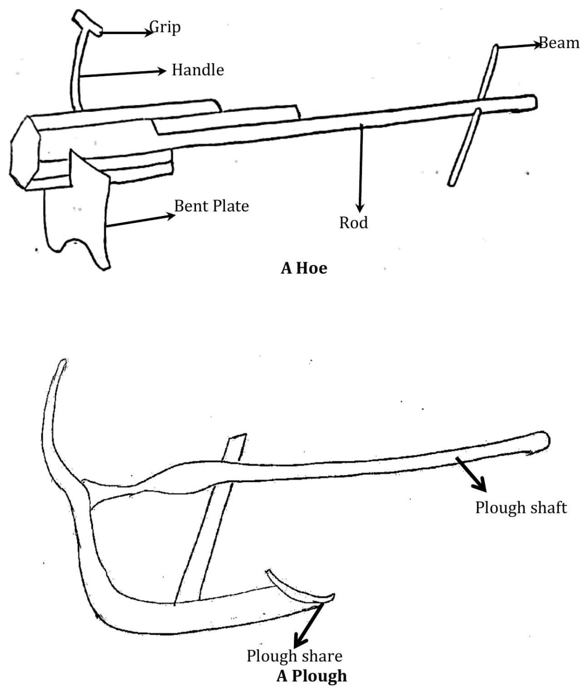 - Hoe: This is used for removing weeds and for loosening the soil. It has a long rod of wood or iron. A strong, broad and bent plate of iron is fixed to one of its ends which works like a blade. It is pulled by animals.
